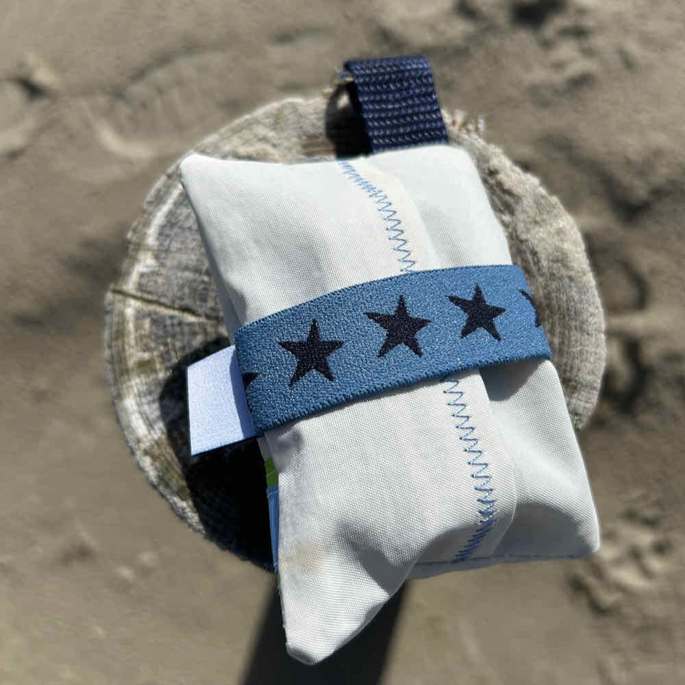 Jeder Hundebesitzer kennt das Problem: Die Befestigung und der Transport von Gassibeuteln. Mit diesem handgefertigten Tütchen-Täschchen aus gebrauchtem weißen Segel gehört dieses Problem der Vergangenheit an. Dank des Karabinerhakens können Sie das Täschchen an Ihrer Jacke, Ihrer Tasche oder der Hundeleine, einfach überall.