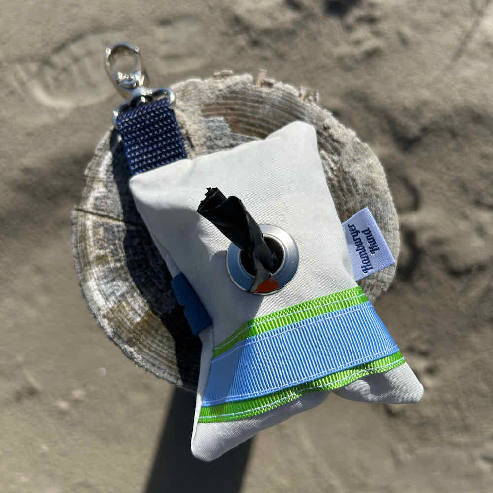 Jeder Hundebesitzer kennt das Problem: Die Befestigung und der Transport von Gassibeuteln. Mit diesem handgefertigten Tütchen-Täschchen aus gebrauchtem Segel in weiß mit neonfarbigem Ripsband in grün und hellblau gehört dieses Problem der Vergangenheit an. Dank des Karabinerhakens können Sie das Täschchen an Ihrer Jacke, Ihrer Tasche oder der Hundeleine, einfach überall befestigen.