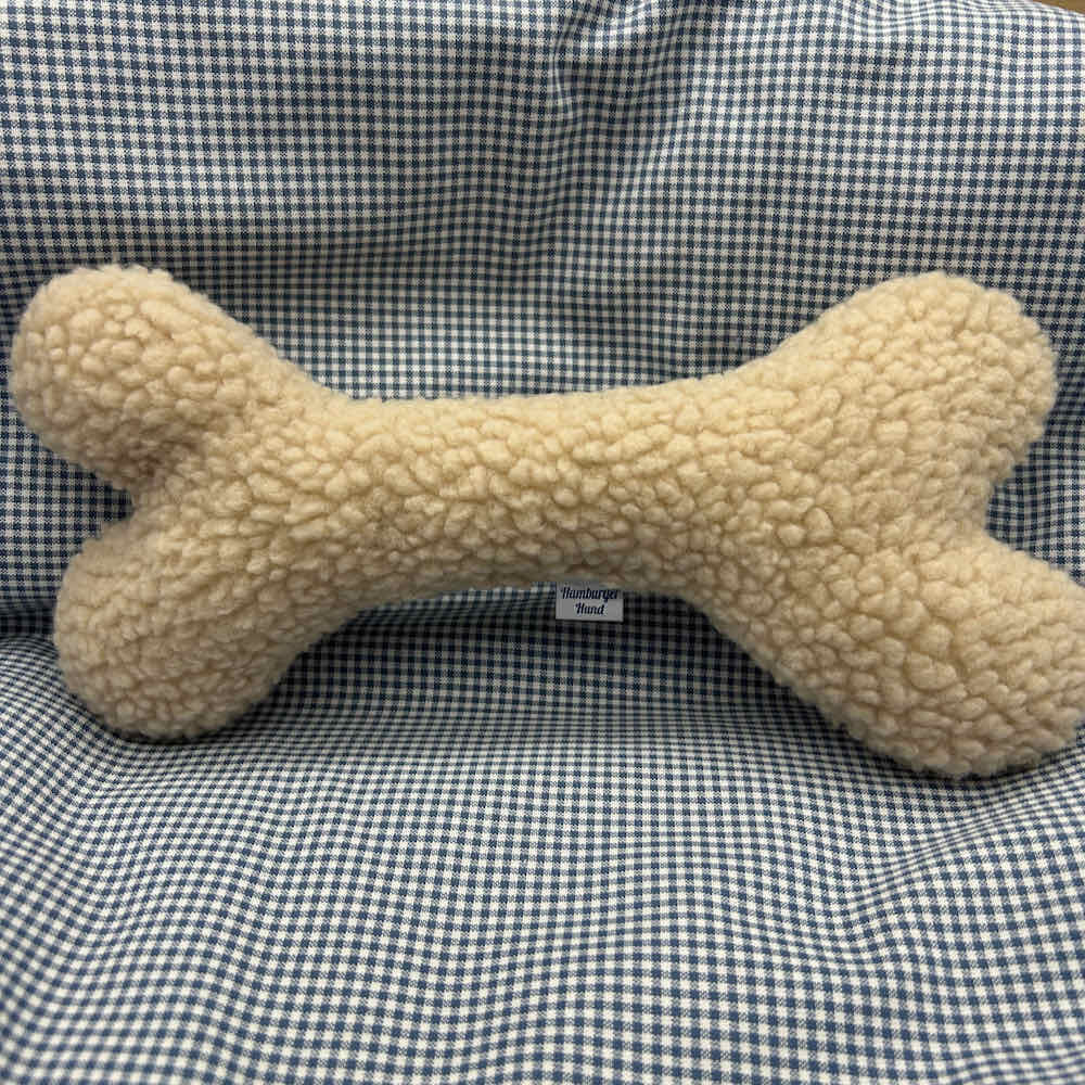 Handgenähter Stoffknochen aus Teddyplüsch. Zum Tragen, Zerren, sich um die Ohren schleudern oder zum drauf liegen. Genau das Richtige für einen Welpen.